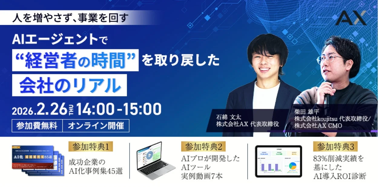 2026年2月26日(木)に、株式会社AXと株式会社koujitsuの共催でオンラインセミナー「人を増やさず、事業を回す ー AIエージェントで”経営者の時間”を取り戻した会社のリアル」が開催されます。このセミナーでは、AIエージェントを活用して「経営者の時間」を取り戻す実践ノウハウが解説され、副業で効率化を目指す方にとっても、具体的なヒントが満載の内容です。
