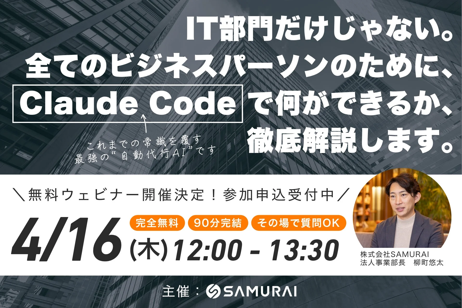 株式会社SAMURAIは、この「Claude Code」の可能性を実感できる無料ウェビナー『Flash Hack Live:IT部門だけじゃない!すべてのビジネスパーソンのための「Claude Code」で何ができるかがわかる』を開催します。