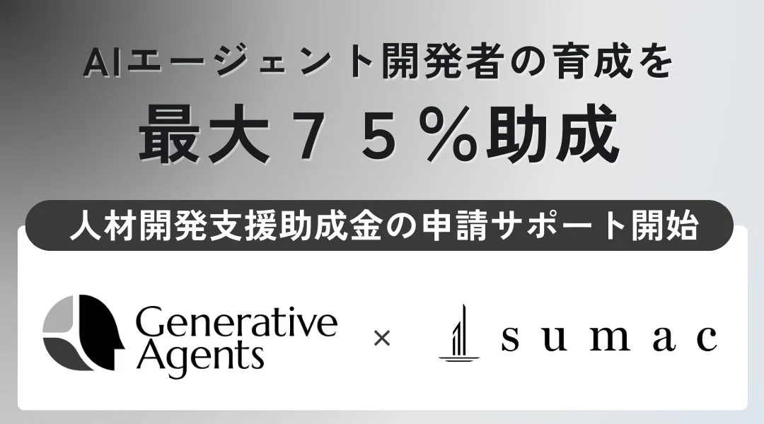 そんな声に応えるため、ジェネラティブエージェンツは社会保険労務士法人sumacと連携し、助成金申請サポートの提供を開始しました。これにより、助成金制度の活用に伴う煩雑な事務手続きの負担が軽減され、企業や個人が安心してAIエージェント開発者の人材育成に取り組める環境が整います。