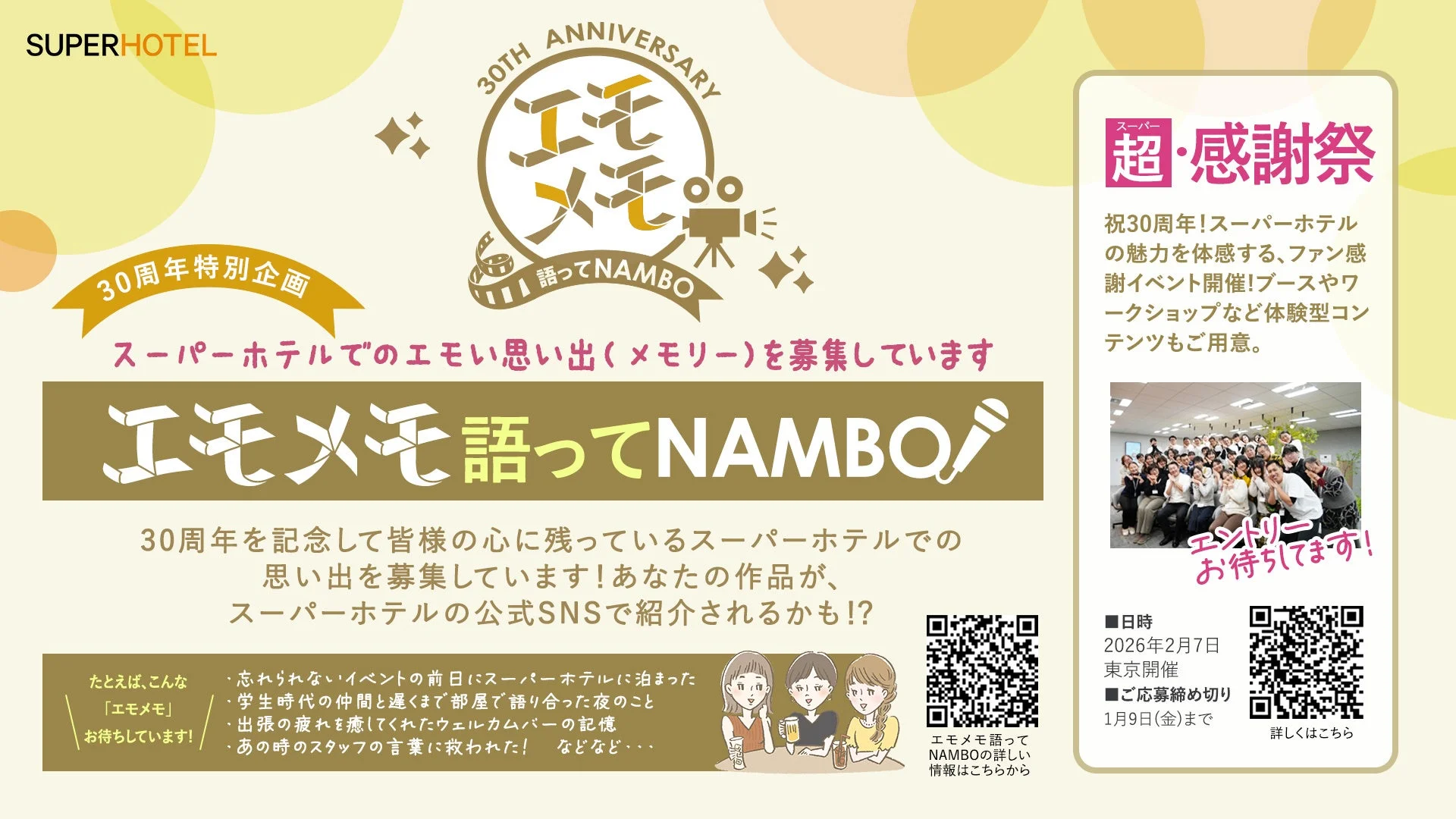 「Natural, Organic, Smart」をコンセプトに、国内外で178店舗のホテル運営を手掛けるスーパーホテルは、2026年1月に創業30周年を迎えます。この記念すべき節目に、スーパーホテルはこれまで支えてくれたお客様への感謝を込めて、心温まる特別な企画をスタートしました。それが、あなたの「エモーショナル・メモリー」、略して「エモメモ」を募集するキャンペーンです。