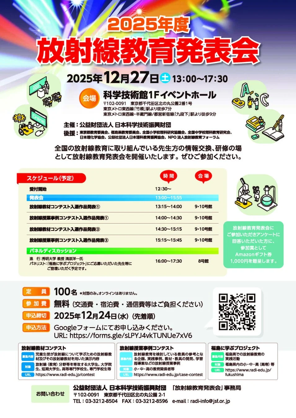 これらのコンテストの成果を広く共有するため、2025年12月27日(土)には科学技術館(東京都千代田区)にて「放射線教育発表会」が開催されます。この発表会は、全国の放射線教育関係者が一堂に会し、情報交換と研修を行う貴重な機会です。