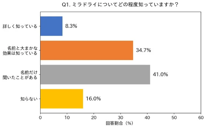 ミラドライについてどの程度知っているかという調査では、「詳しく知っている」と答えた人はわずか8.3%でした。最も多かったのは「名前だけ聞いたことがある」で41.0%、次いで「名前と大まかな効果は知っている」が34.7%という結果に。関心は高くても、その詳細まで理解している人は少ないことがわかります。