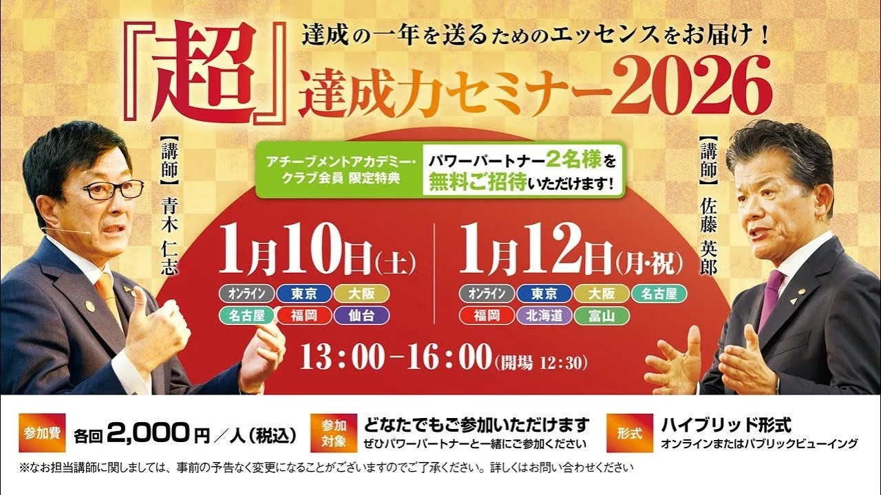 新年の目標を単なる「願望」で終わらせず、「現実」に変えるための具体的な一歩を、この「『超』達成力セミナー」で踏み出してみませんか?延べ51万名の人材育成を支援してきた実績を持つプロのノウハウを学び、全国の志を同じくする仲間と高め合うことで、2026年を最高の「超」達成の一年にするためのスタートダッシュを切ることができるでしょう。この機会を活かして、あなたの、そしてあなたのビジネスの未来を大きく変えるきっかけにしてください。