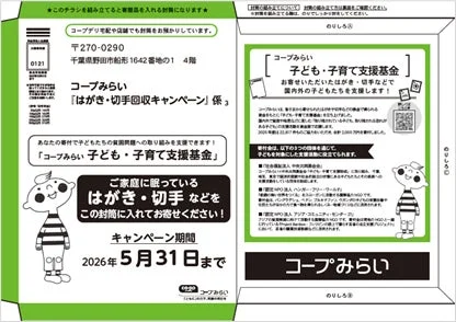 このキャンペーンの目的は、ご家庭で不要になったはがきや切手などを回収し、それを換金して「コープみらい 子ども・子育て支援基金」の原資とすること。この基金を通じて、国内外で飢餓、貧困、格差などに直面している子どもたちを支援する団体へ寄付が行われます。
