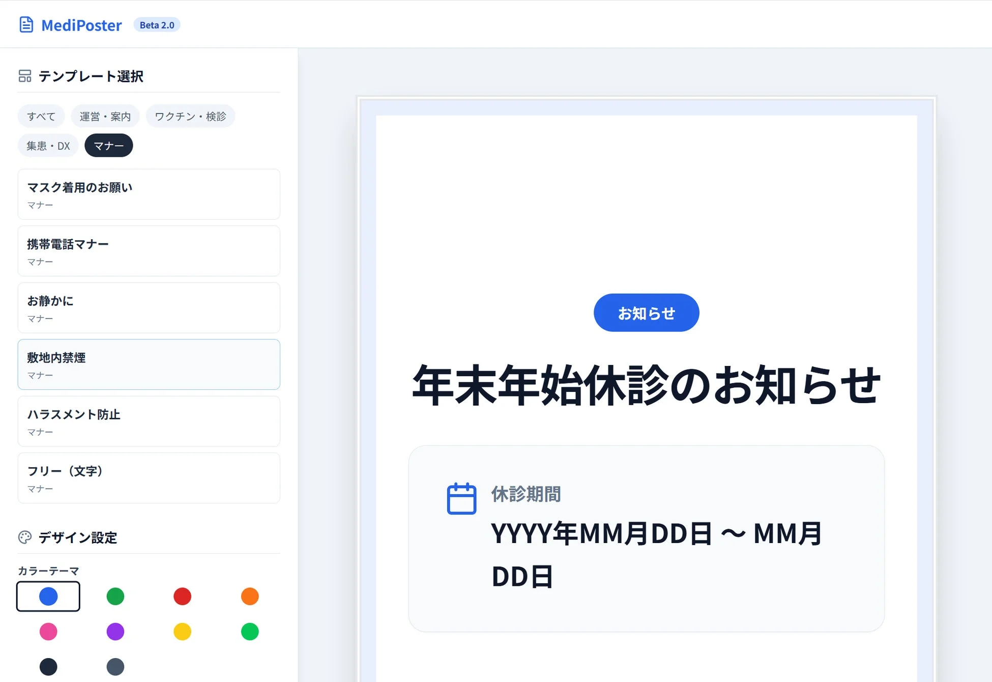 休診日のお知らせやワクチン接種の案内、感染症対策のお願いなど、クリニックや病院で頻繁に使用されるポスターを数クリックで作成できます。年末年始休診、インフルエンザ予防接種、発熱外来のご案内、マスク着用のお願いといったテンプレートが豊富に用意されており、文字を打ち換えるだけでプロ並みの掲示物が完成します。詳細はこちらからご確認ください。- https://mediposter.meta-alchemist.co.jp/### 2. 医療用ラベル作成ツール「MediLabel(メディラベル)」