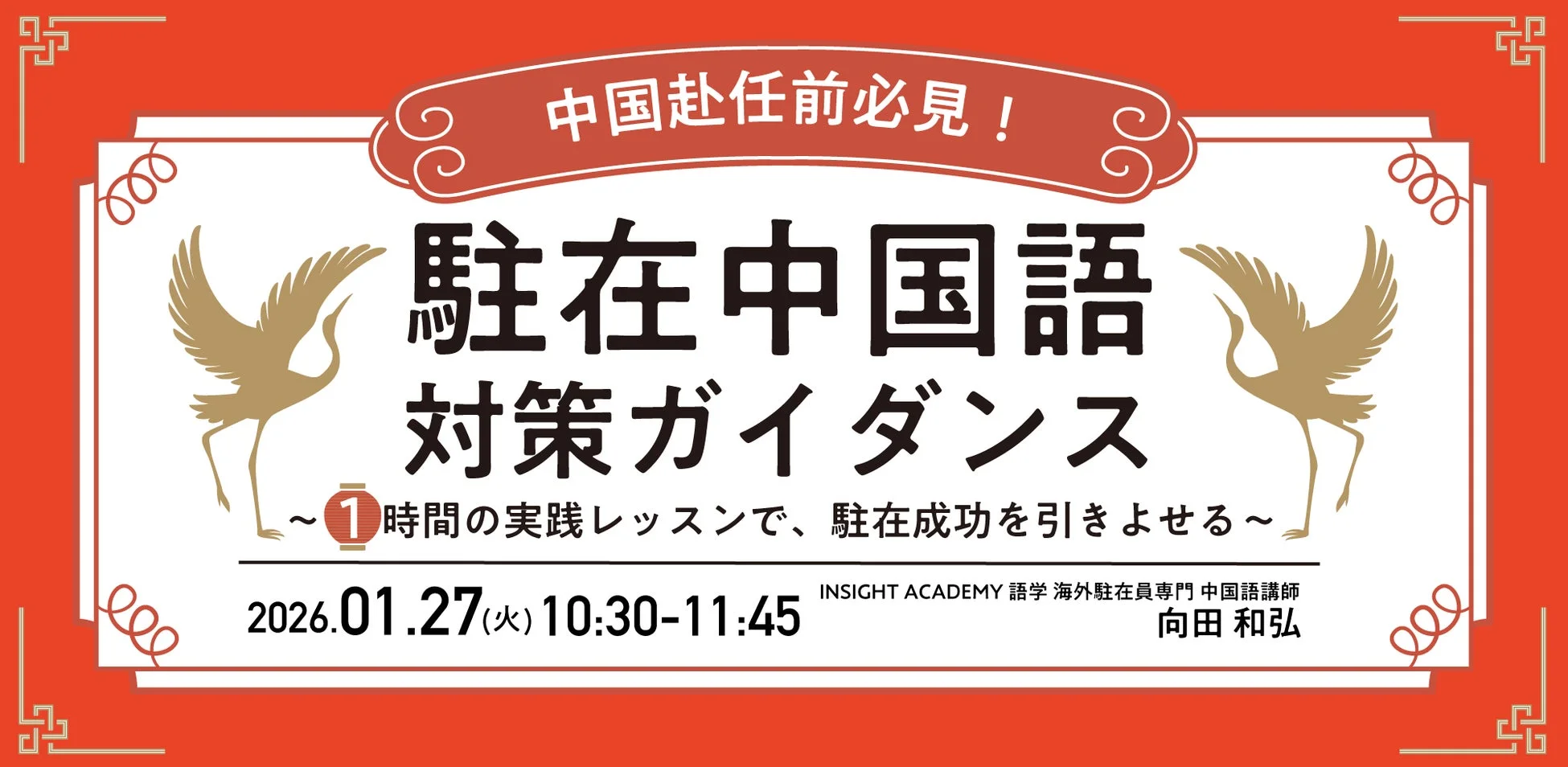 グローバル人材育成・研修業を手掛けるインサイトアカデミー株式会社は、こうした中国赴任前の不安を解消し、駐在を成功に導くための無料Webセミナー「【中国赴任前必見!】”駐在中国語” 対策ガイダンス~1時間の実践レッスンで、駐在成功を引きよせる~」を2026年1月27日(火)に開催します。このセミナーは、中国語学習を始めたばかりの方でも、現地で「一目置かれる」レベルに到達するための具体的なステップと、忙しい駐在員に特化した学習術を提供します。
