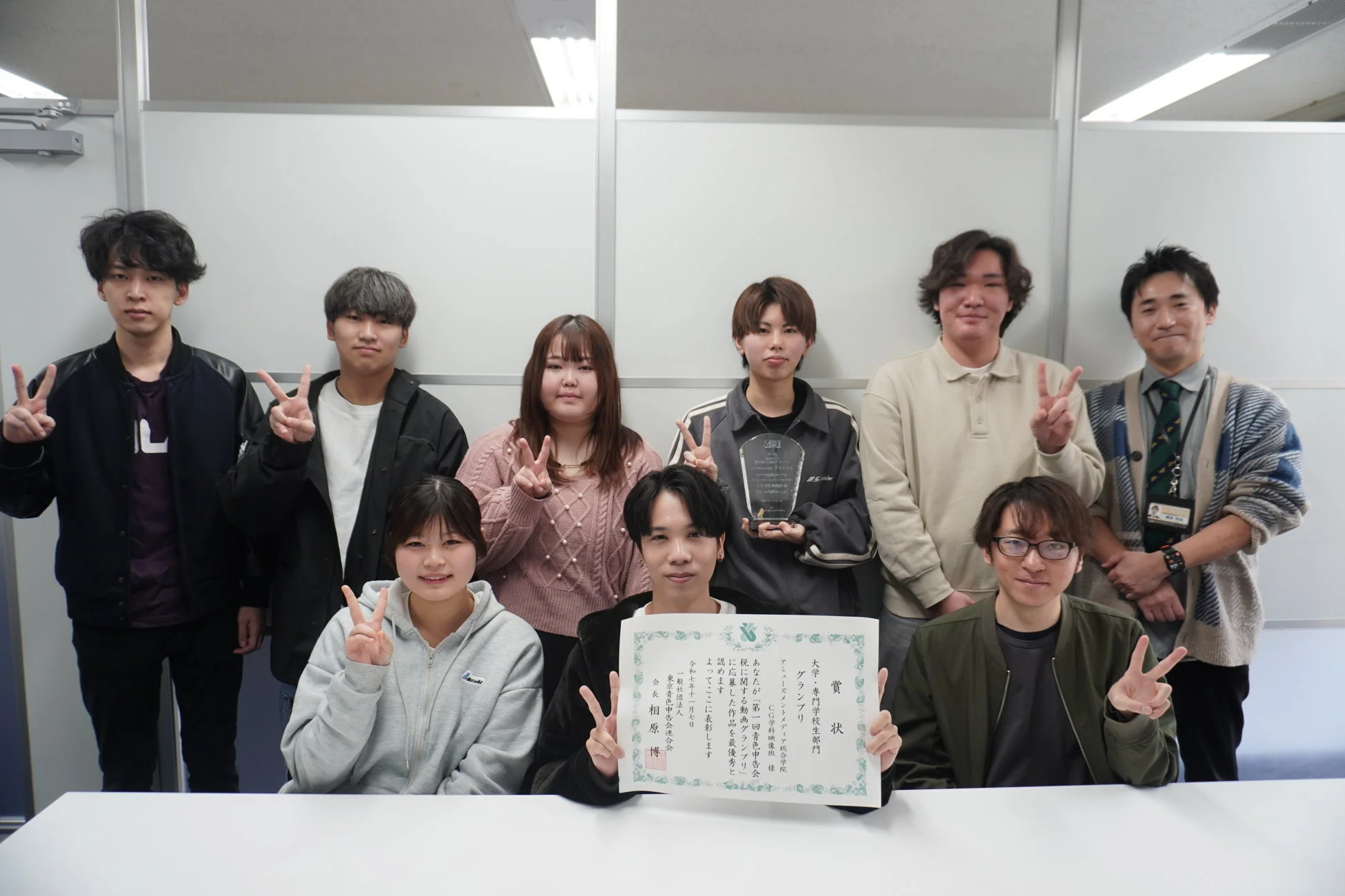 11月7日には、東京青色申告会館で表彰式が開催され、チームを代表してCG学科の上釜佑太さんと声優学科の太田さんが出席。賞状、クリスタルトロフィー、そして賞金10万円が授与されました。