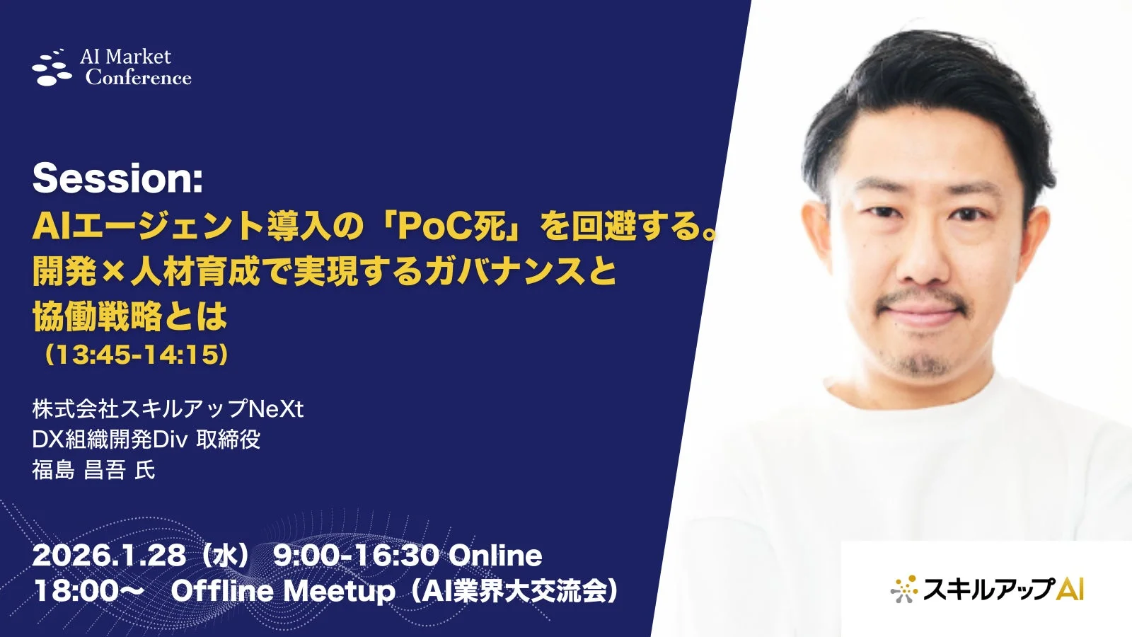 スキルアップNeXt社が提唱する「開発と人材育成の両輪」によるガバナンスと協働戦略は、「PoC死」や「AIの座礁資産化」といった多くの企業が直面する課題に対する具体的な解決策を示しています。AI Market Conference 2026は、この戦略を深く理解し、自社のAI活用を成功させるための第一歩となるでしょう。ぜひこの機会を活かし、AIエージェントと共に企業の未来を切り拓いてください。
