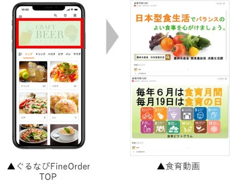実証実験では、ぐるなびが提供するモバイルオーダーシステム「ぐるなびFineOrder」が中心的な役割を担います。注文の入り口から完了まで、段階的に栄養バランスへの意識を高める工夫が凝らされています。