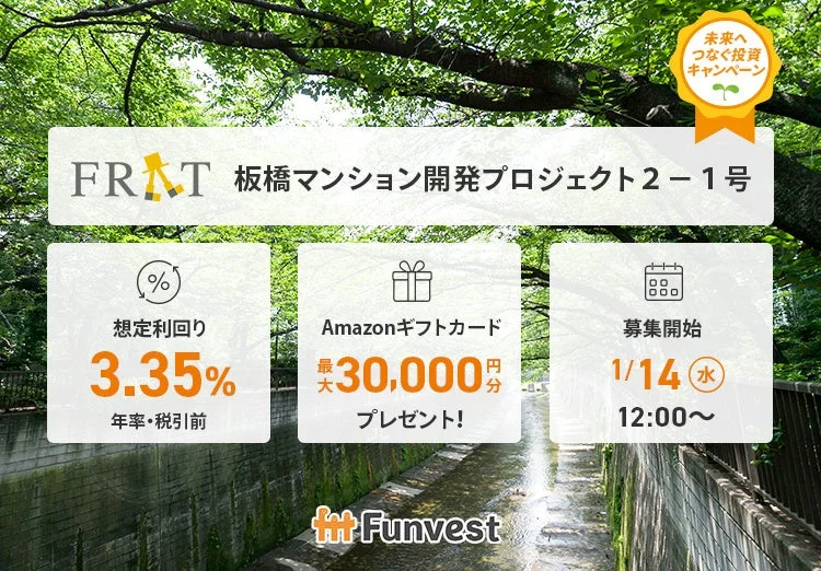 この度、Funvestは2026年1月14日より、新ファンド「FRAT 板橋マンション開発プロジェクト2-1号」の募集を開始しました。このファンドは、株式会社FRATが手掛ける販売用不動産建築資金として、投資家の皆様からの出資金を貸し付け、運用するものです。