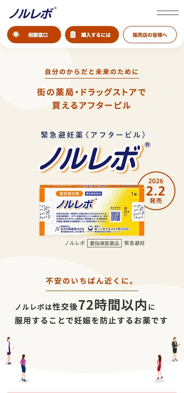「ノルレボ®」のブランドサイトは、緊急避妊薬に関する正しい情報を求める女性のために開設されました。ここでは、製品の詳しい情報はもちろん、購入から服用までの流れを動画でわかりやすく解説しています。