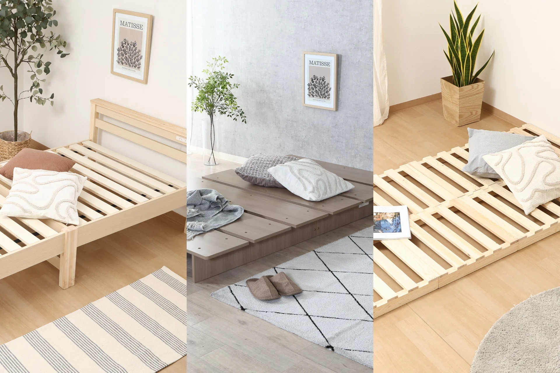 木目調のロースタイルは、お部屋を広く見せる効果とモダンなデザイン性を両立。シングル・セミダブルサイズで、通気性の良いすのこが快適な寝環境を保ちます。