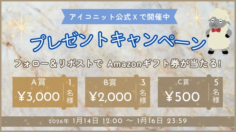 そして、今ならAmazonギフトカードが当たるSNSキャンペーンのチャンス!参加はとても簡単なので、ぜひこの機会に「アイコニット」を体験し、お得なギフトカードをゲットしてください。