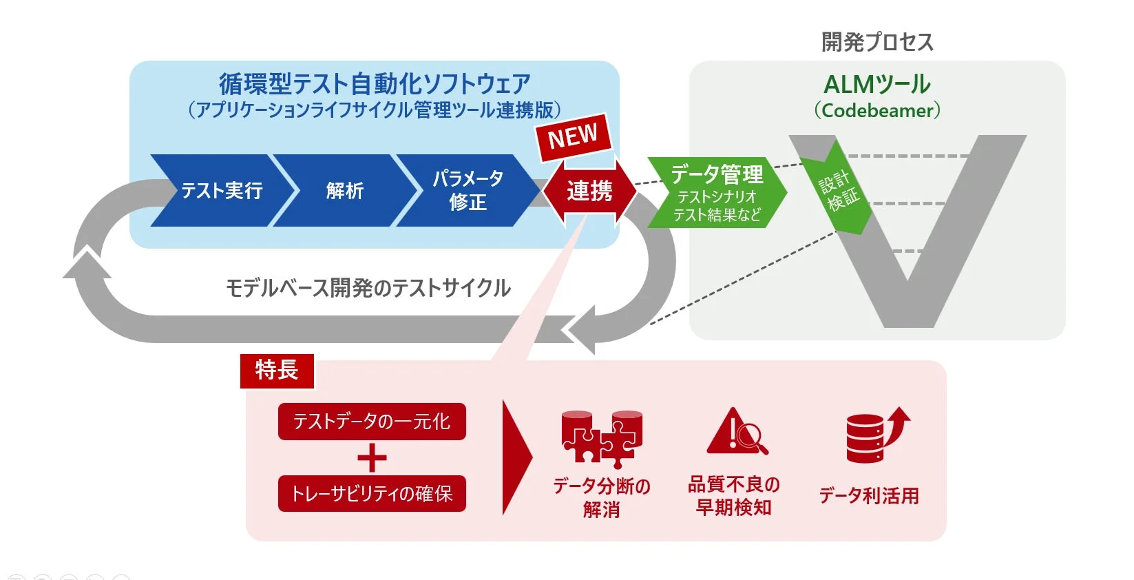 このソリューションは、シミュレーションテストの検証結果をCodebeamerへ自動的に反映させることで、これまで分断されがちだったテストサイクルと開発プロセスのデータをシームレスにつなぎます。これにより、テスト仕様書から結果までの一元的なデータ管理とトレーサビリティの確保を実現し、開発現場に新たな基盤をもたらします。
