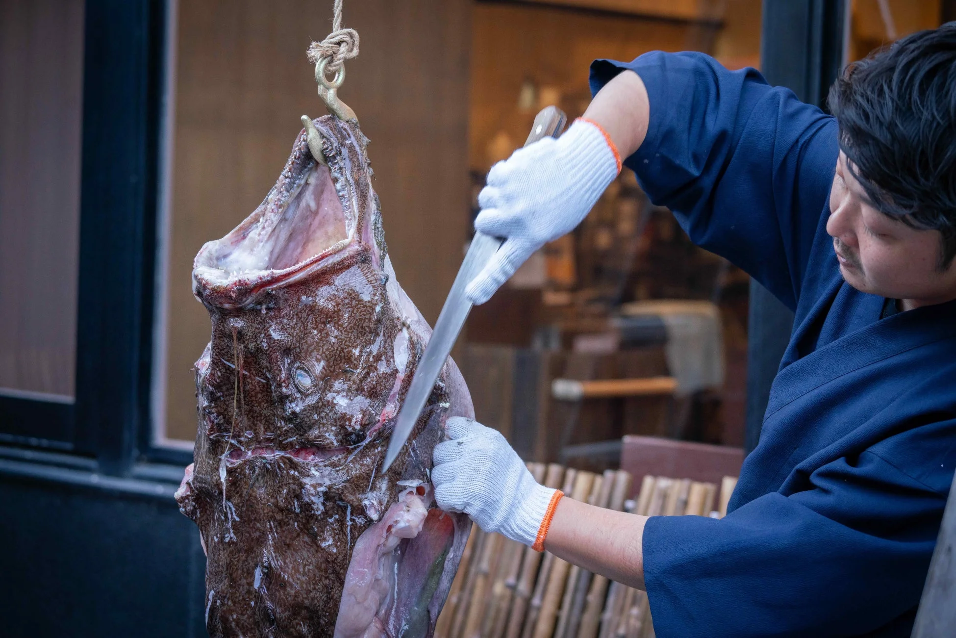 通常、アンコウのつるし切りは、ヌメリが強くまな板では捌きにくいアンコウを吊るし、重力を利用して捌く伝統的な調理法です。この珍しい光景が、海から離れた埼玉県で実施されるという意外性が、イベントの大きな魅力となっています。