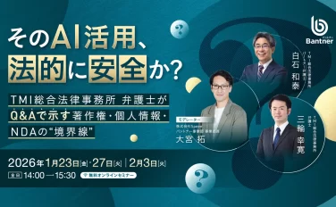 AI導入を検討する企業が直面する著作権、個人情報、NDAに関する法的リスクを、TMI総合法律事務所の弁護士がQ&A形式で徹底解説する無料ウェビナーが開催されます。安全なAI活用で生産性向上と競争力強化を実現し、DX推進の加速を目指しましょう。