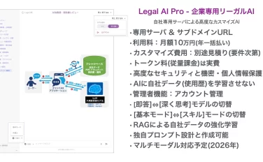 Legal AI株式会社が提供を開始した「Legal AI Pro」は、これまでバラバラだったリーガルテックツールを一つのプラットフォームに統合する、法律業務特化型LLMです。シームレスなデータ連携、常駐型AIアシスタント、カスタマイズ可能なプロンプトにより、法務業務の生産性を劇的に向上させ、コスト削減、競争力強化に貢献します。セキュリティも万全で、法律事務所や企業の法務部にとって、まさに次世代の法務コックピットとなるでしょう。